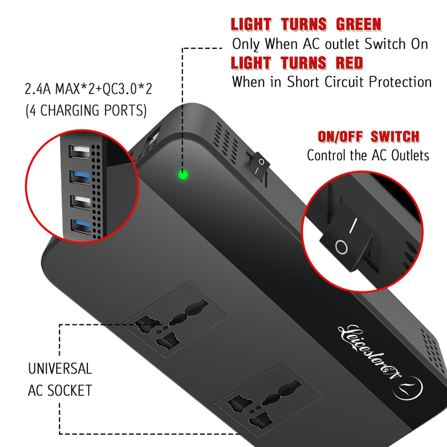 【Upgraded】LST 200W 220V Car Power Inverter Original DC 12V to 220V AC Car Converter 2 AC Outlets 4 USB Ports Adapter(2*QC3.0 Fast Charging Port) DC to AC Inverter with Digital Display