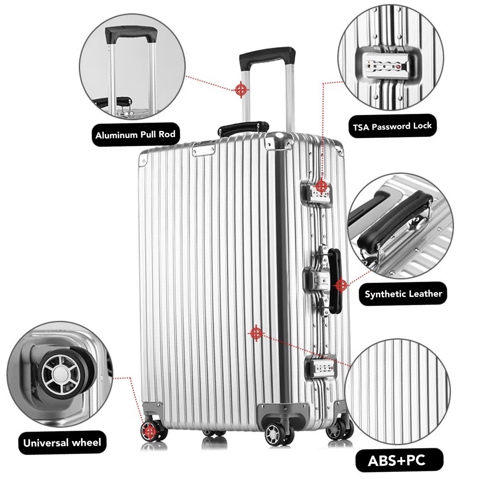 *Brand: No Brand *Texture: ABS+PC *Lock: TSA Password Lock *Wheel: Universal Wheel 360 Rotation *Pull Rod: Multi-Position Adjustment Shake Within 1CM *Handle: Synthetic Leather *Lining Material: Polyester *Internal: Zipper Pocket Cell Phone Pocket *Size: 20 inch-54*37*23CM 29 inch-76*51*29CM *Weight: 20 inch-4kg 29 inch-6kg *May Change of Mind,7 Days Return to Seller *Warranty 3 Months