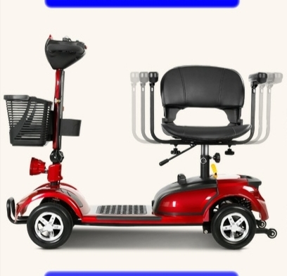 24v 12a lead-acid battery, 250w motor. The seat can be rotated 360 degrees and the armrest can be raised.speed:2-8km/h. maximum load 120kg.