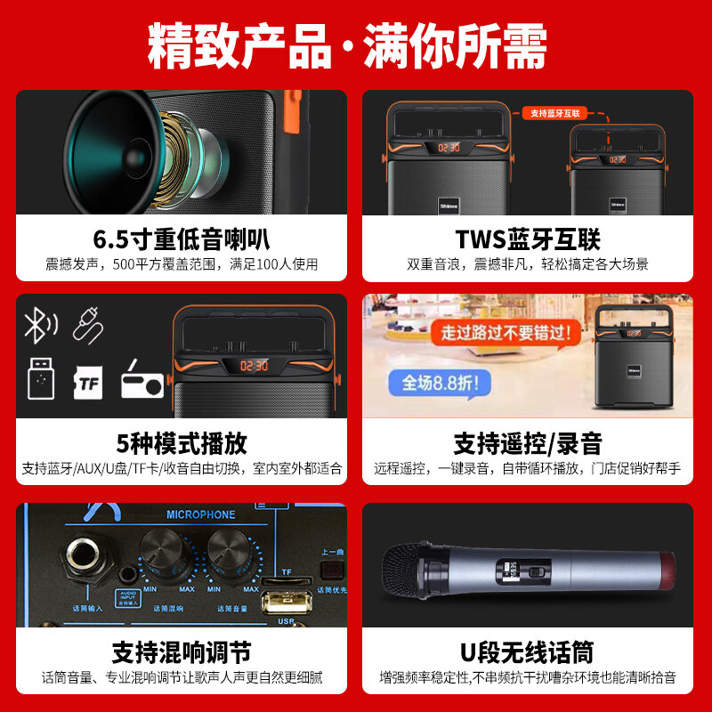 Square Dance Audio Outdoor Portable High-Power Portable Bluetooth Speaker with Wireless Microphone Karaoke Subwoofer