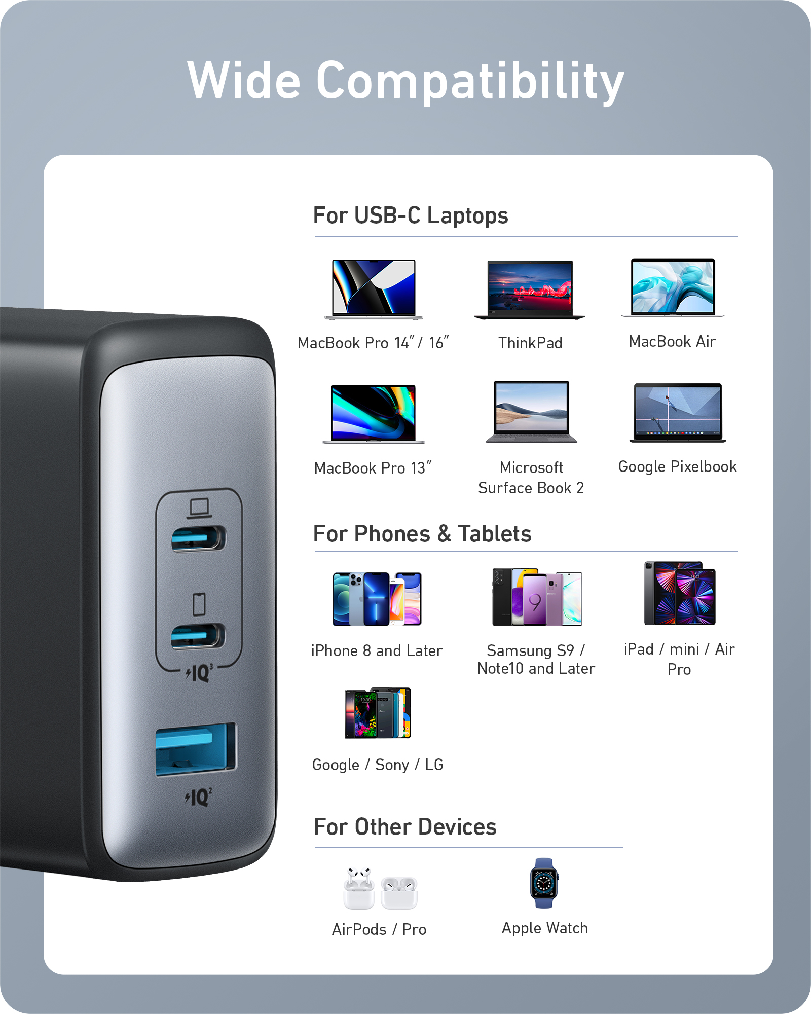 3-Port Fast Compact Wall Charger for iPhone 14/14 Plus/14 Pro/14 Pro Max, iPhone 13 Series, iPhone 12 Series, MacBook Pro/Air, Google Pixelbook, ThinkPad, Dell XPS, iPad Pro, Galaxy S22/S20 and More
