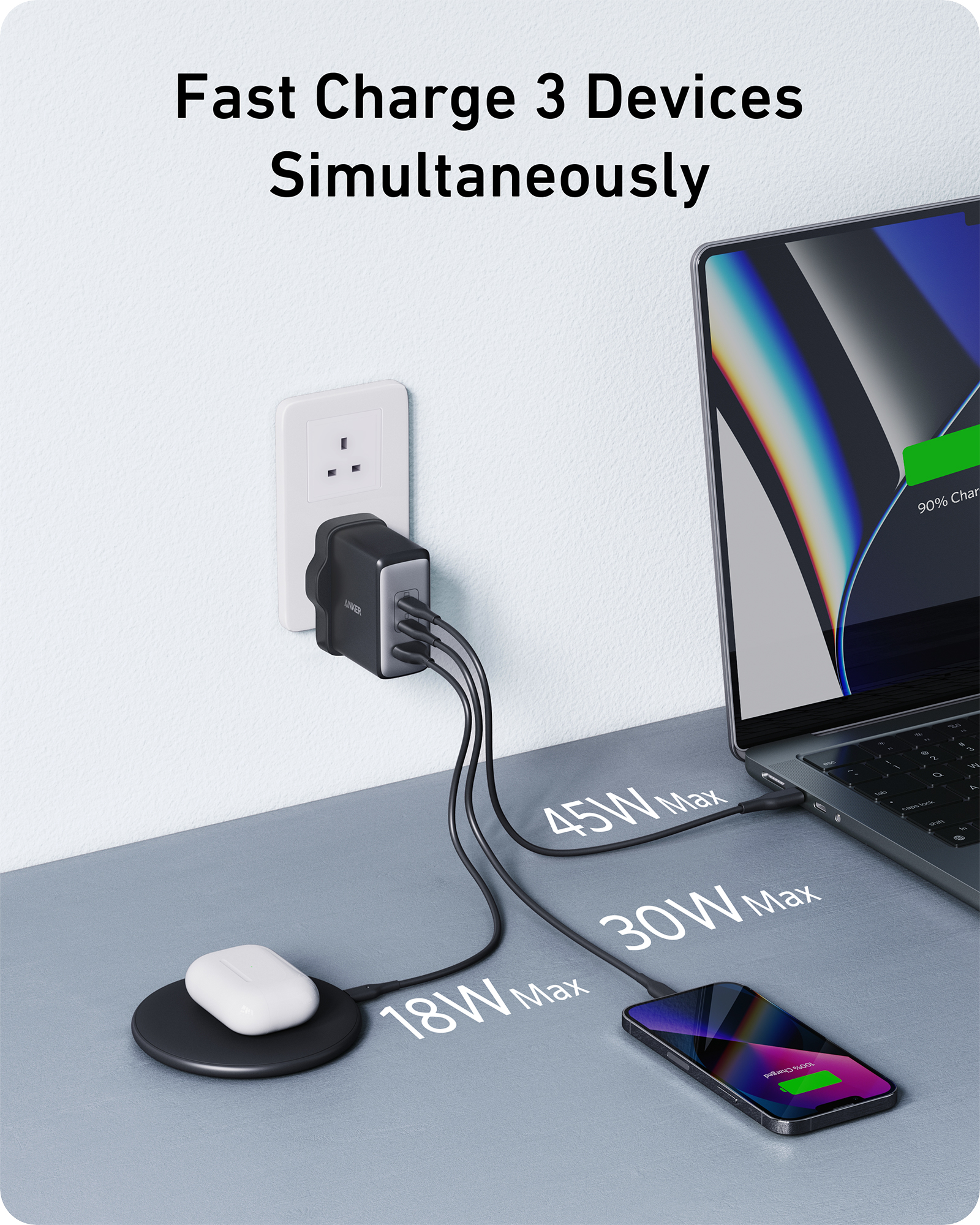 Triple Port: USB-C 1 (45W Max), USB-C 2 (30W Max), USB-A (18W Max)