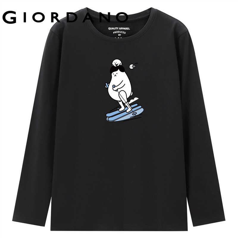 GIORDANO Women WHIKO Series T-Shirts 100% Cotton Cute Print Pattern Casual T-Shirts Long Sleeve Crewneck Simple Tee 99392150