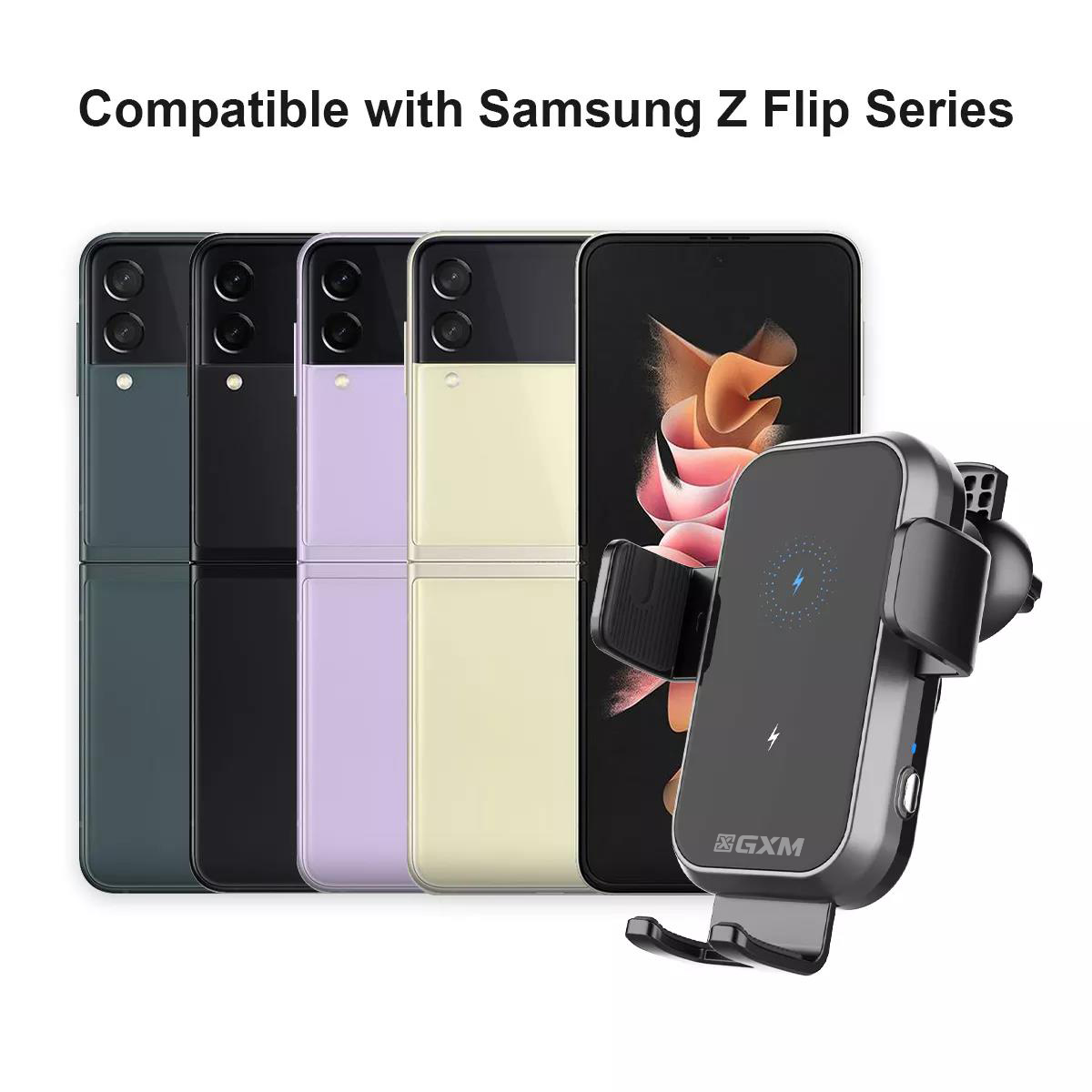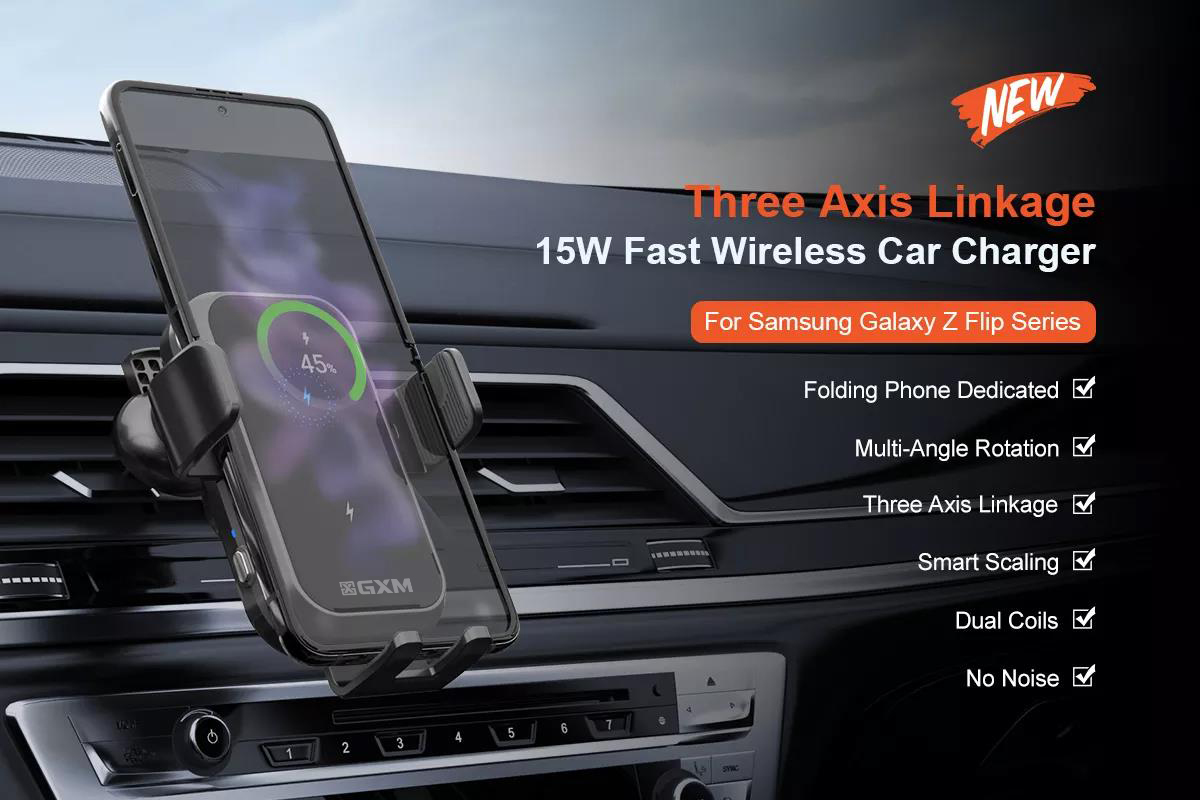 GXM CH01 15W Dual Coil Car Wireless Charger Phone Holder Compatible with Samsung Z Flip Series Three Axis Multi-angle Rotation Auto Clamping Car Phone Holder
