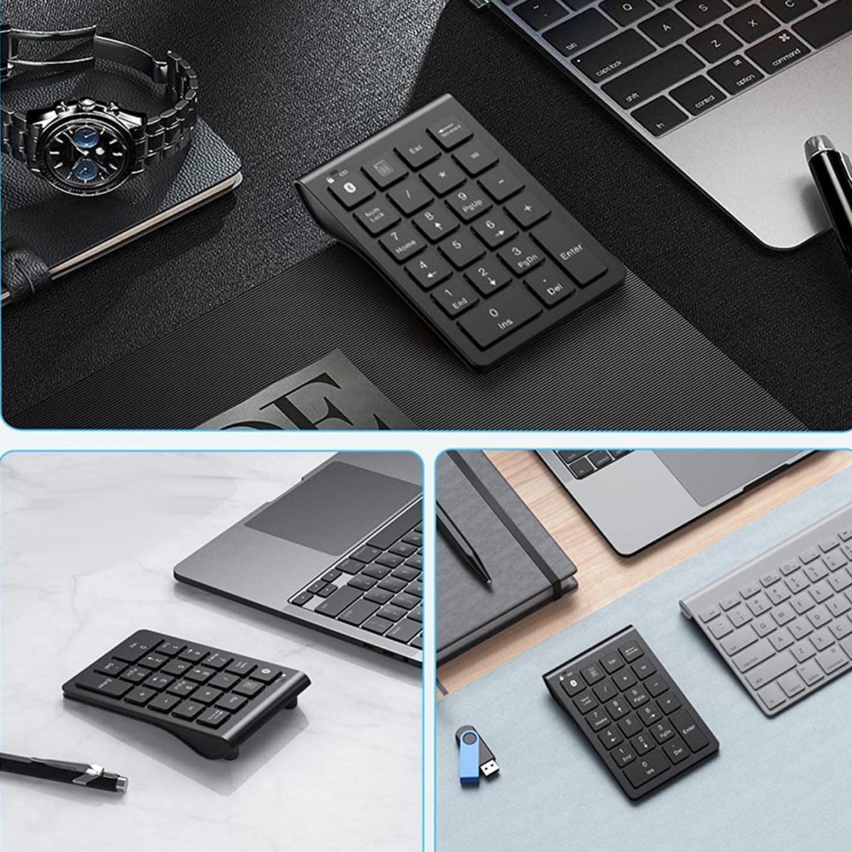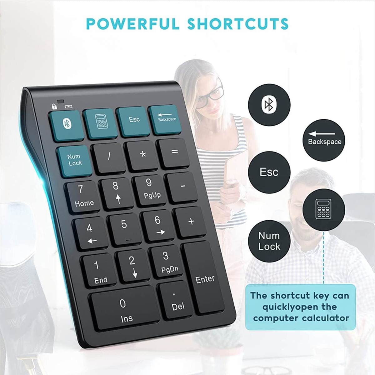 [Multifunctional 22-Key Numeric Keypad]With 22 full-size keys (enhanced scissor switches and mute keycaps), support 0-10 number keys, +, -, *, /, plus NumLock, ESC, PgUp, PgDn, Delete and shortcut keys for quick access to the calculator and increased productivity. The multi-functional Bluetooth digital keyboard is an ideal choice for bookkeepers to process excel, teachers to enter grades, office workers to enter data, etc.