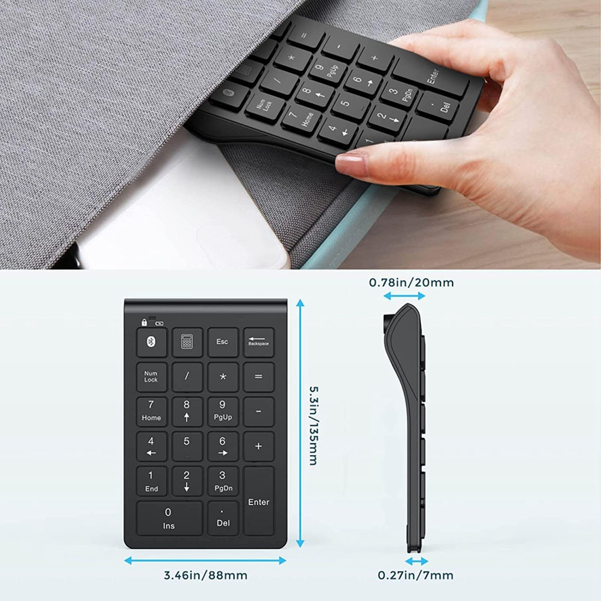 [Stylish, Portable and Ergonomic Design]Our bluetooth 10-key numeric keypad weighs only 93g/0.2 lbs, 5.2*3.46*0.27 inches; lightweight and portable. Easily slip this slim bluetooth keyboard into your laptop bag, backpack, suitcase or pocket without taking up space. The integrated ergonomic slope provides a comfortable and smooth typing experience and reduces stress. The compact wireless number pad is perfect for home, office, travel, business trip and more.