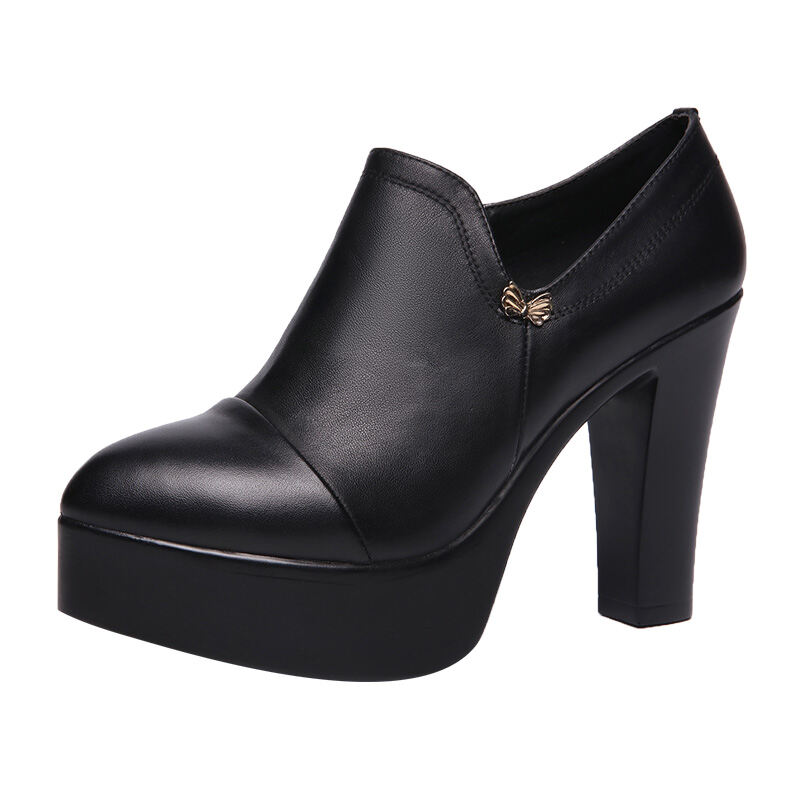 High Heel Single-Layer Shoes for Women 2022 Autumn and Winter New Deep Mouth Pointed Toe Chunky Heel Waterproof Platform Genuine Leather Large Size 40-43 Size Women's Shoes