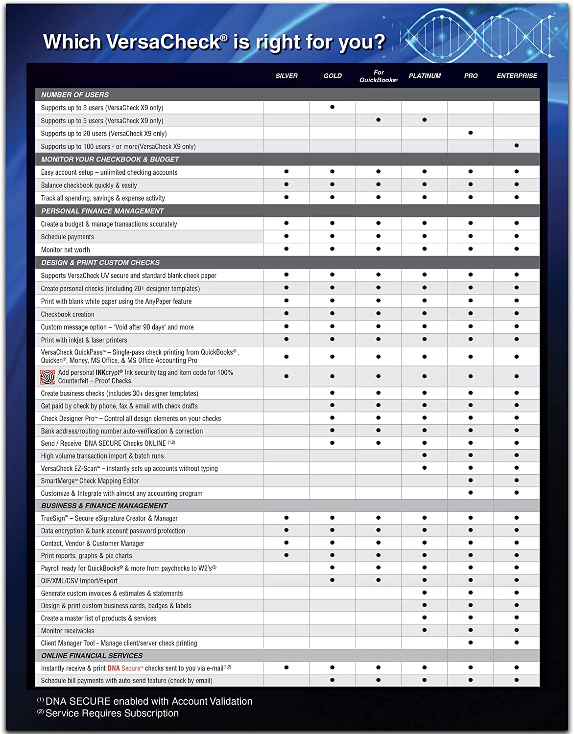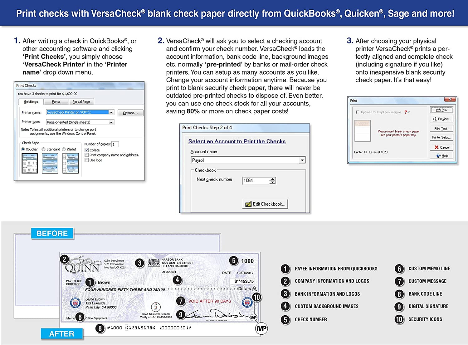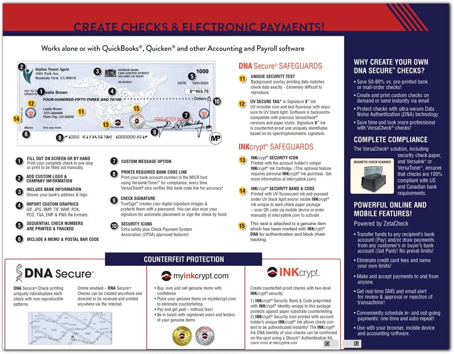 • Includes VersaCheck Software Download, License for 5 Users, and 165 Print Validation codes. Additional print codes included FREE in VersaCheck Check Paper packaging.